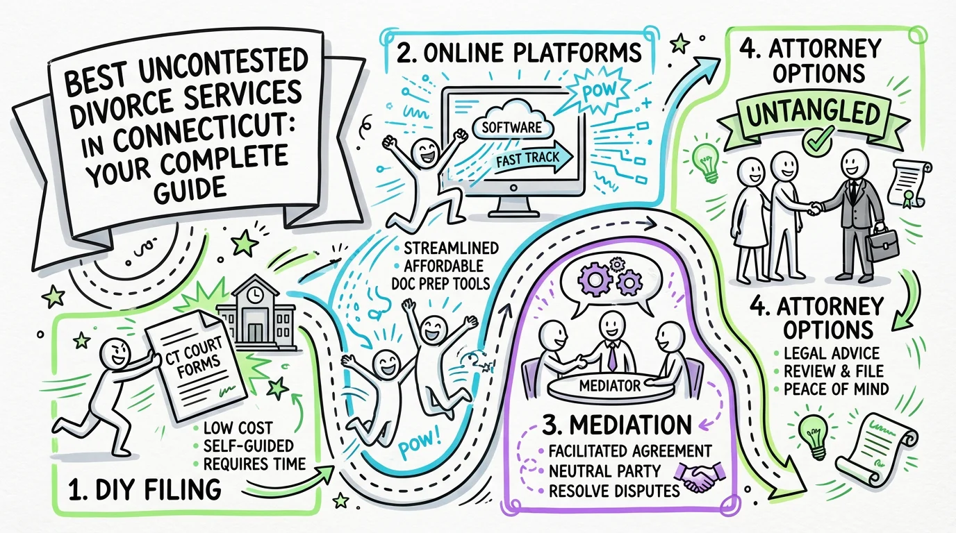 Compare the best uncontested divorce services in Connecticut. Learn about DIY filing, online platforms, mediation, and attorney options for couples who agree.