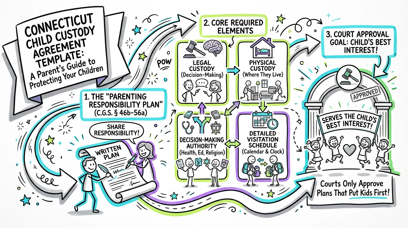 A Connecticut child custody agreement (officially called a "parenting responsibility plan") must include specific provisions about legal custody, physical custody, decision-making authority, and a detailed visitation schedule. Under C.G.S. § 46b-56a, Connecticut courts require parents to submit a written plan that addresses how both parents will share responsibility for raising their children—and the court will only approve agreements that serve the child's best interests.