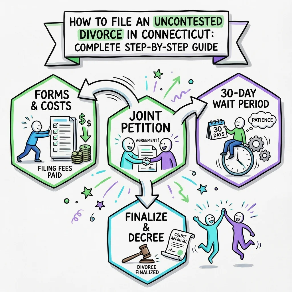 Learn how to file an uncontested divorce in Connecticut. Step-by-step guide covering joint petition requirements, forms, costs, and the 30-day process.