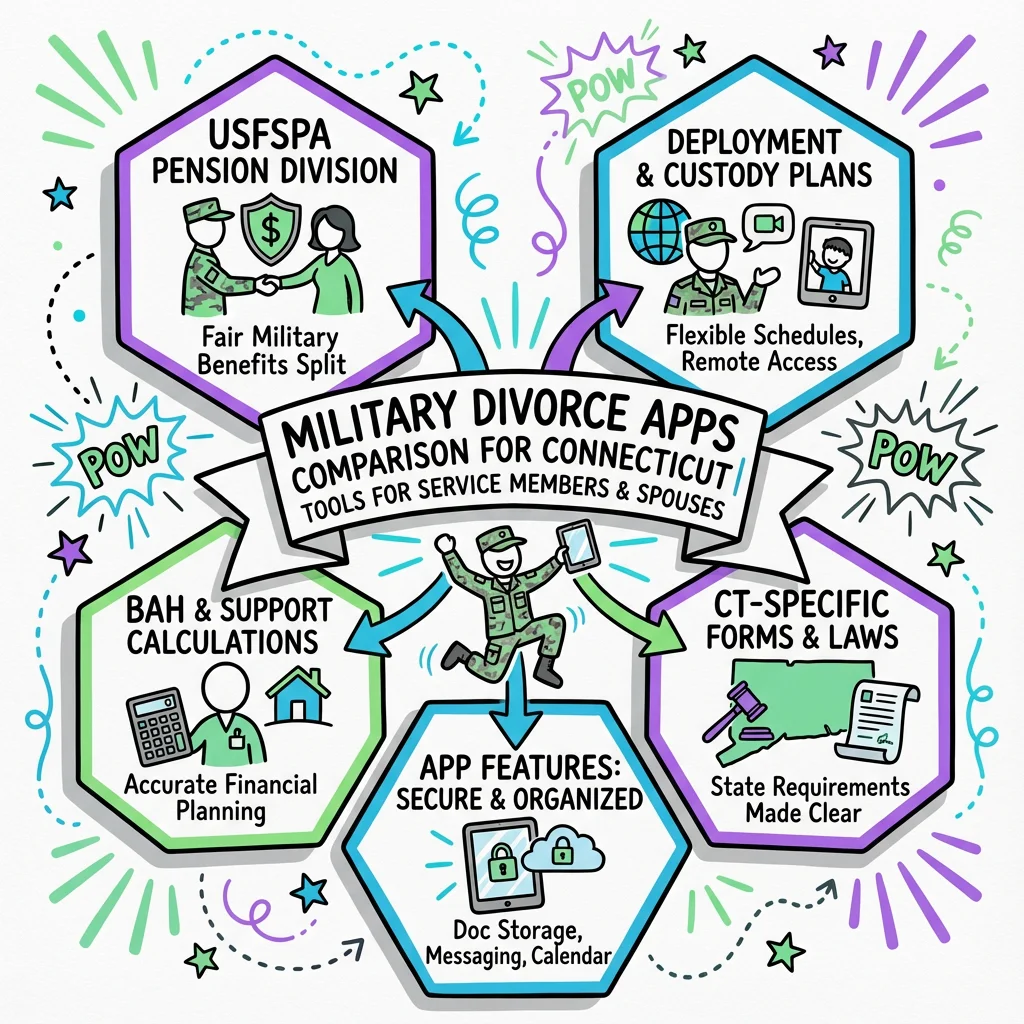 Compare military divorce apps for Connecticut cases. Learn which tools handle USFSPA, deployment custody, BAH calculations, and military-specific requirements.