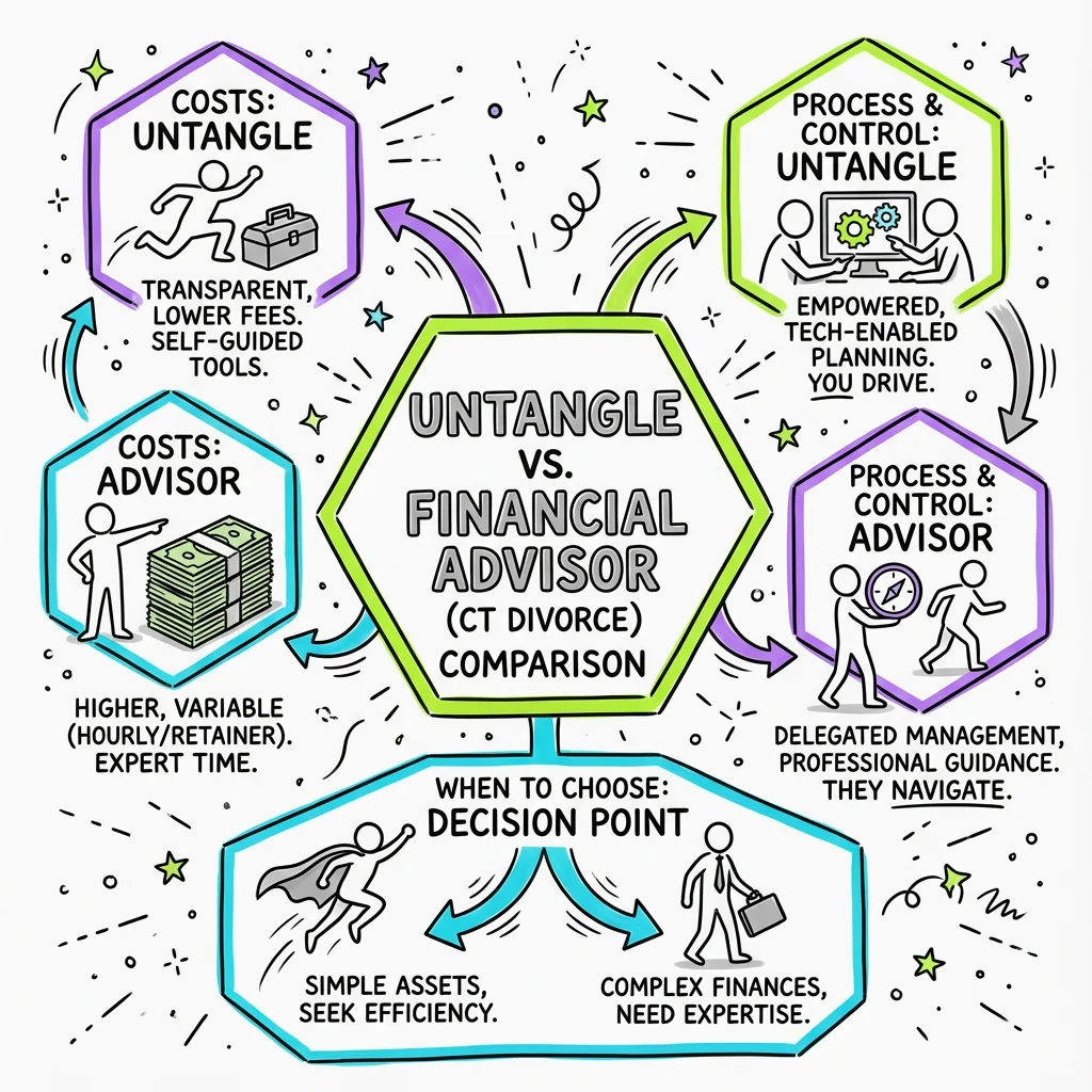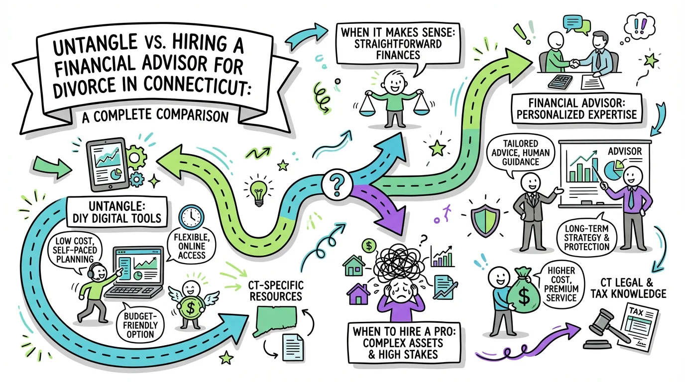 Compare Untangle's divorce planning tools with hiring a financial advisor for your Connecticut divorce. Learn costs, benefits, and when each option makes sense.